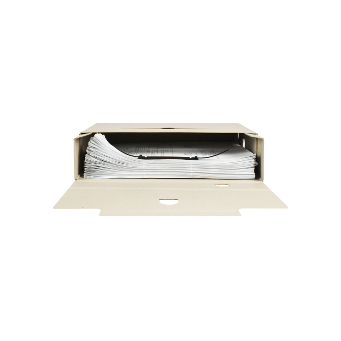 Ekologický výrobok. Box z recyklovateľnej špeciálne impregnovanej lepenky odolnej voči atmosferickej vlhkosti na dlhodobé uloženie záznamov. Tri varianty postavenia, kvalitná sieťotlač. Vhodný v kombinácii so skupinovým boxom. Väčšie balenie 25 ks. Rozmery (š x v x d) 75 x 330 x 260 mm.