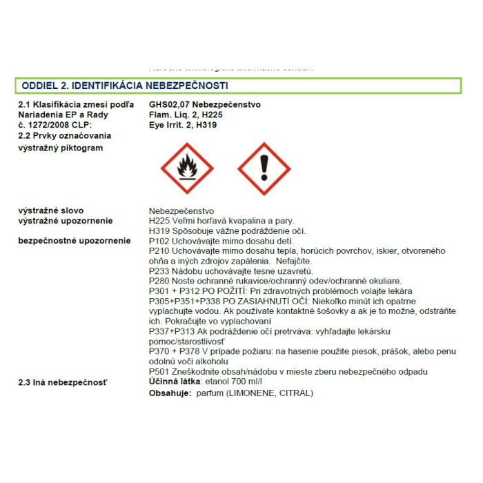 Upozornenie: H225 Veľmi horľavá kvapalina a pary. H319 Spôsobuje vážne podráždenie očí. bezpečnostné upozornenie P102 Uchovávajte mimo dosahu detí. P210 Uchovávajte mimo dosahu tepla, horúcich povrchov, iskier, otvoreného ohňa a iných zdrojov zapálenia. Nefajčite. P233 Nádobu uchovávajte tesne uzavretú. P280 Noste ochranné rukavice/ochranný odev/ochranné okuliare. P301 + P312 PO POŽITÍ: Pri zdravotných problémoch volajte lekára P305+P351+P338 PO ZASIAHNUTÍ OČÍ: Niekoľko minút ich opatrne vyplachujte vodou.