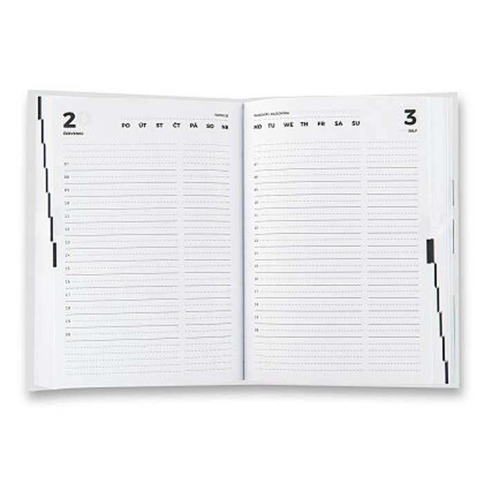 Univerzálny diár na ľubovoľný rok s pevnými laminovanými doskami a šitou väzbou. Denný záznam, každý deň je na jednej strane s časovým rozvrhom 7:00 - 21:00. 192 listov. Vyrobený z bezdrevného papiera Text v češtine a angličtine
