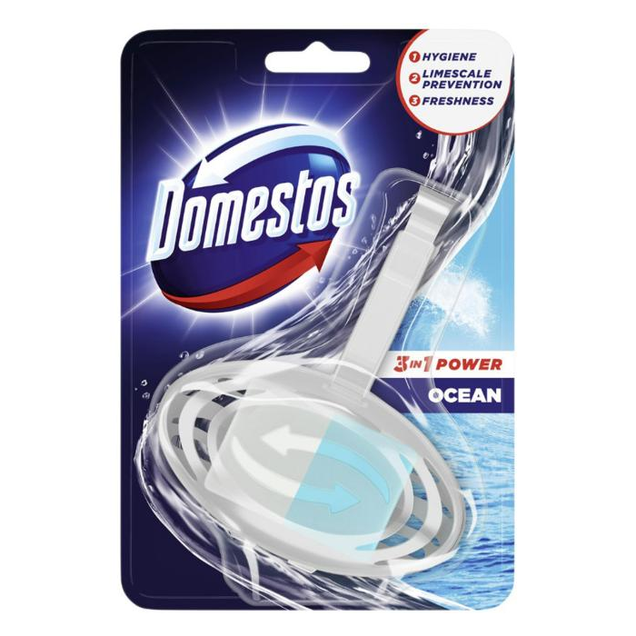 Domestos WC blok 3v1 Ocean zanecháva vašu toaletu čistú, zabraňuje tvorbe vodného kameňa a stará sa o dlhotrvajúcu sviežosť s vôňou oceánu po každom spláchnutí.