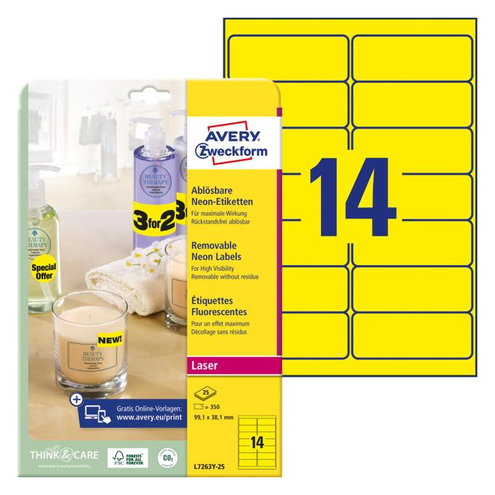 Odnímateľné samolepiace etikety STICK & LIFT odlepiteľné a znovu prelepiteľné (na bežnom povrchu až 5×) bez toho, aby zanechali stopy lepidla. Sú vhodné pre laserové tlačiarne. Využiteľné najmä na každodenné pracovné činnosti, ako napr. vytváranie popisov, cenoviek, označovanie výrobkov, majetku a pod. Farba neónovo žltá. Etikety na hárku 14 ks. Balenie 25 hárkov.