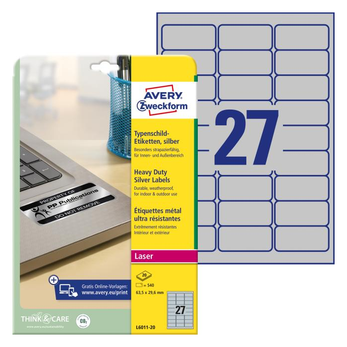 Veľmi odolné polyesterové etikety odolné voči oleju, prachu, špine, natrhnutiu, vode. Odolávajú teplotám od −40 ° do + 150 °C. Určené pre tlač v laserových tlačiarňach. Vhodné aj pre vonkajšie použitie. Rozmery v mm : 63,5 × 29,6. Farba strieborná. Etikety na hárku 27 kusov. Balenie 20 hárkov.