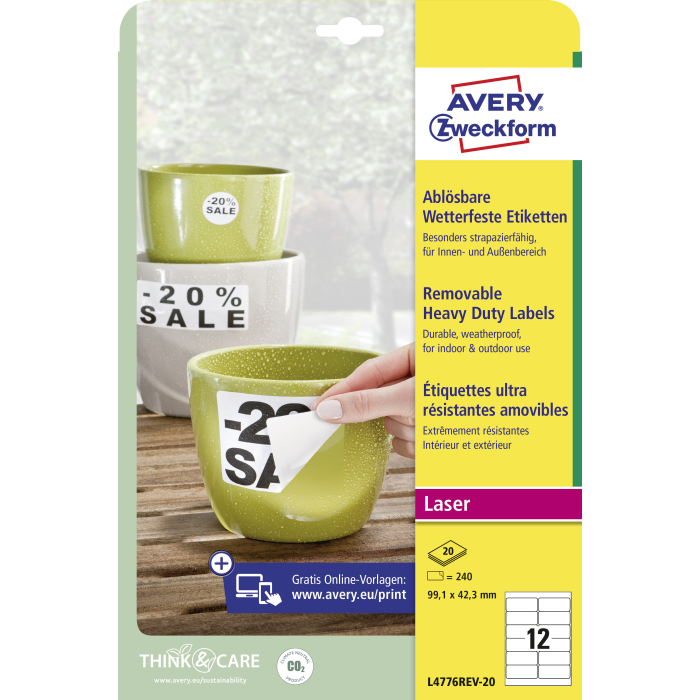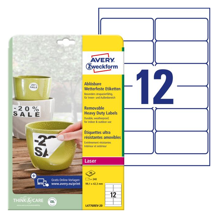 Veľmi odolné polyesterové etikety s nepermanentným lepidlom umožňujú odlepenie etikety bez zanechania stôp po lepidle. Sú odolné voči natrhnutiu, mastnote, nečistotám, UV žiareniu a teplotám od −20 ° do +80 °C a vhodné pre tlač v laserových tlačiarňach a kopírkach. Rozmery v mm : 99,1 × 42,3. Farba biela. Etikety na hárku 12 kusov. Balenie 20 hárkov.