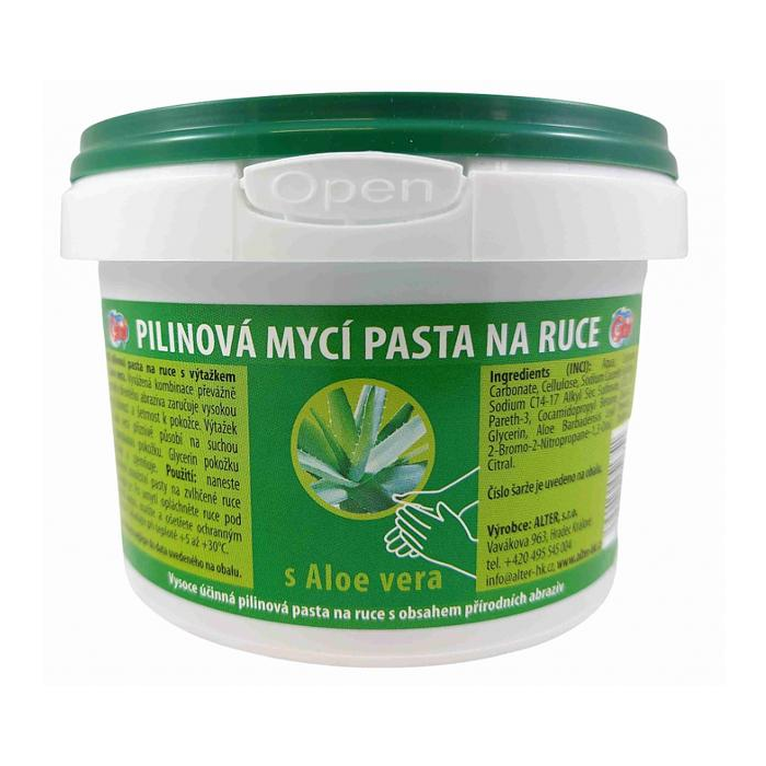 Vysoko účinná umývacia pasta na ruky s obsahom prírodných abrazív, prevažne drevitých pilín a výťažkov z aloe vera.