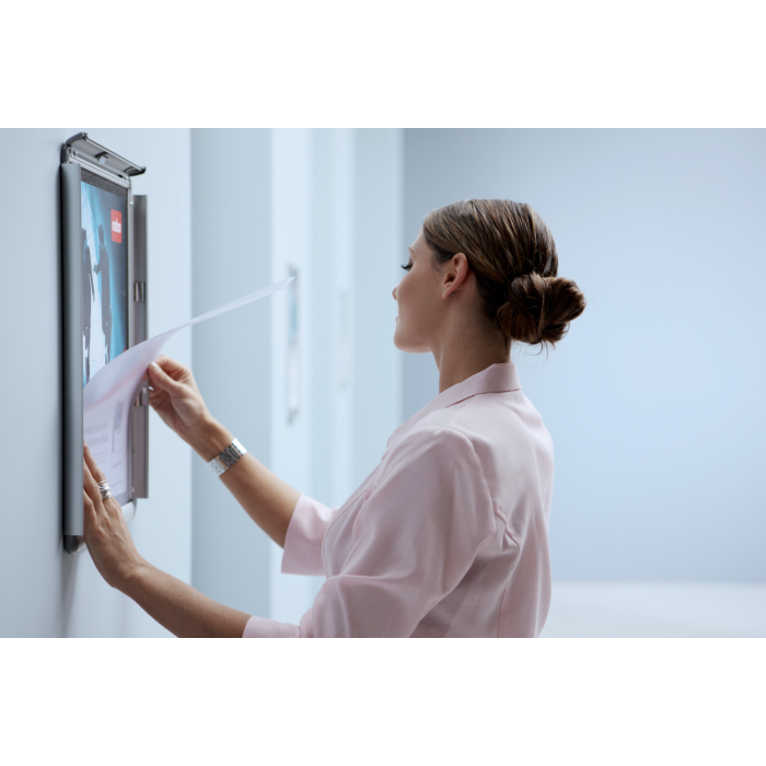 Rám na zobrazovanie informácií, plagátov alebo propagačných ponúk do interiéru aj exteriéru. Mechanizmus otvárania na  klip, antireflexná fólia z PVC na ochranu pred špinou a prachom, vkusný hliníkový rám s tmavosivými rohovými spojkami. Formát A3. Rozmery v × š × h : 335 × 458 × 17 mm. Dodávaný s montážnou sadou.