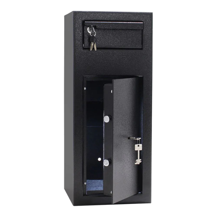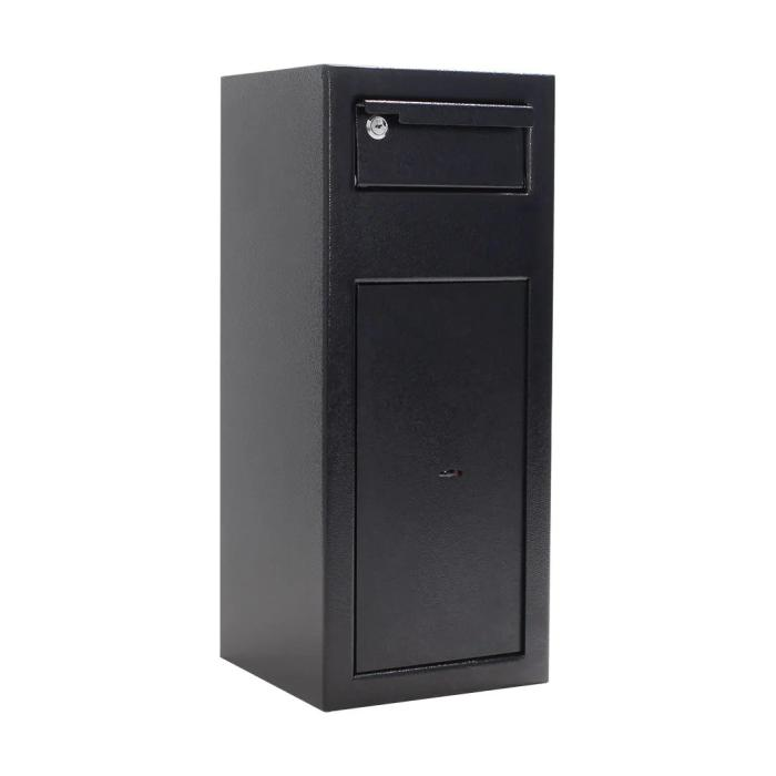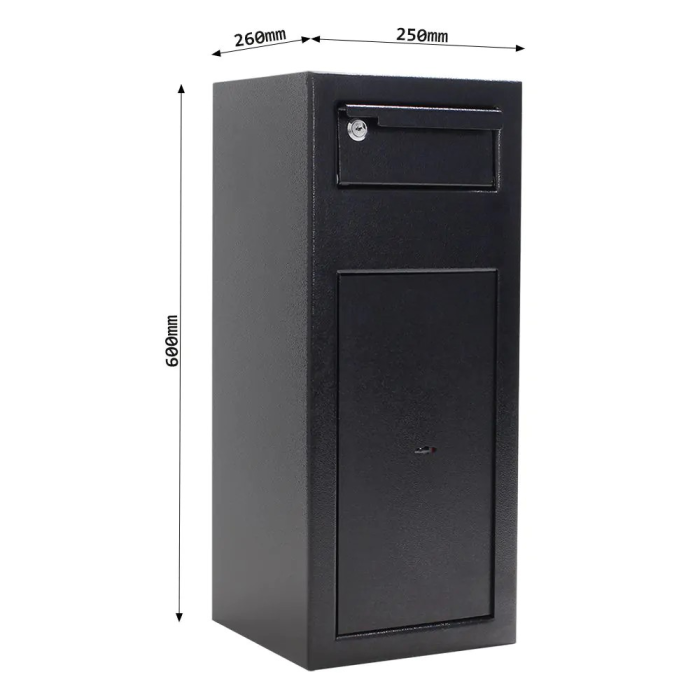 Výborne navrhnutý a bezpečný sejf s vhadzovacím mechanizmom v čiernej farbe je ideálny pre kancelárie, obchody, hotely, školy a iné miesta, kde sa denne manipuluje s hotovosťou. Použitie sejfu s vhadzovacím mechanizmom je naozaj jednoduché a vďaka 4 kľúčom od hornej vhadzovacej zásuvky umožňuje prístup viacerým ľuďom. Pomocou priloženého kľúča otvorte hornú zásuvku a vložte požadovaný predmet. Vďaka protizávažiu sa schránka automaticky zavrie, je ale potrebné zásuvku uzamknúť. Vložený predmet sám prepadne do dolnej časti sejfu. Inkasovaná hotovosť a cennosti tak budú v bezpečí a do sejfu je stále možné vhazovať novú a novú bez ohrozenia už vhodenej hotovosti. Pripravené otvory v dolnej a zadnej časti slúžia na ukotvenie sejfu. Kotviaci materiál je súčasťou balenia.