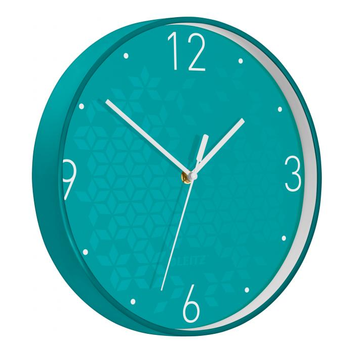 Quartz hodiny z produktového radu Leitz WOW. Tichý chod, dvojfarebný rám z pevného plastu v kombinácii so sklenenou prednou stranou. Jasný ciferník vo WOW farbách s veľkými číslicami, tri kontrastné ručičky viditeľné aj z diaľky. Priemer 29 cm, hrúbka 4,3 cm. Batéria AA nie je súčasťou balenia. Farba ľadovo modrá.