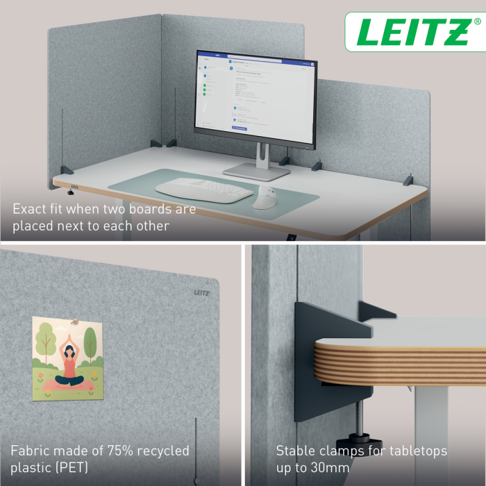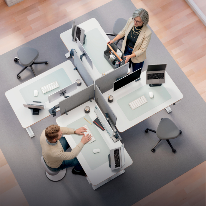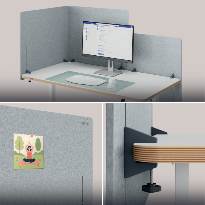 Medzery medzi doskou stola a deliacimi panelmi pre káble a ramená monitorov Leitz.