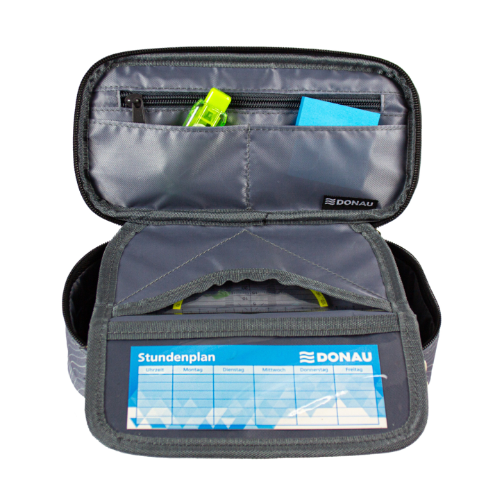 Peračník vyrobený z odolného polyesteru so zipsom. Vo vnútri sa nachádza priehradka na zips a dve praktické vrecká. Vnútorná chlopňa ponúka vrecko na štvorec a priehľadné okienko na rozvrh. Desať pútok na perá udrží veci poriadok. Peračník je prázdny.