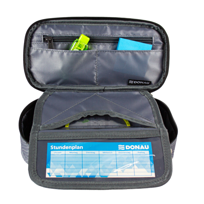 Peračník vyrobený z odolného polyesteru so zipsom. Vo vnútri sa nachádza priehradka na zips a dve praktické vrecká. Vnútorná chlopňa ponúka vrecko na štvorec a priehľadné okienko na rozvrh. Desať pútok na perá udrží veci poriadok. Peračník je prázdny.
