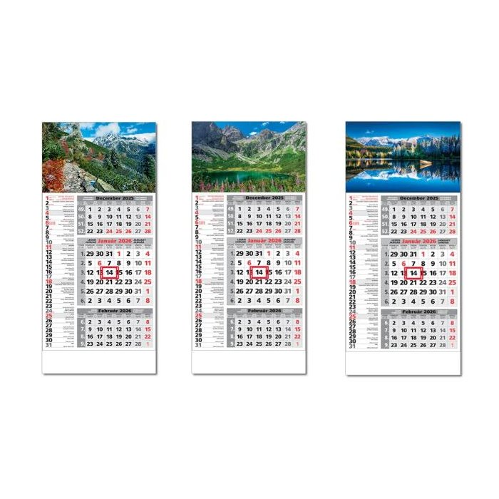 Plánovací 3-mesačný sivý kalendár s priloženou hornou čistou lištou, s menami v SK + CZ, názvy mesiacov a dní v SK, CZ, UK, DE a HU.
