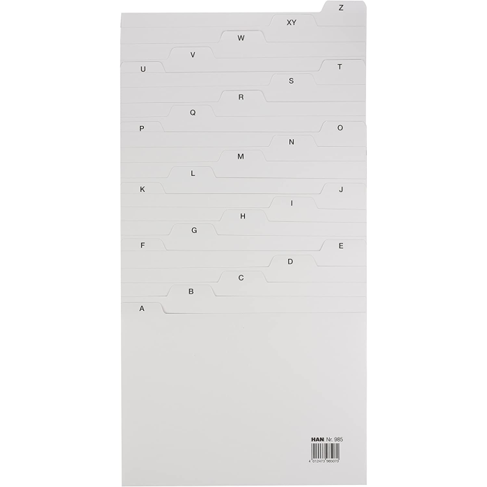 Indexové kartičky A-Z pre stolové kartotéky HAN. Farba sivá.