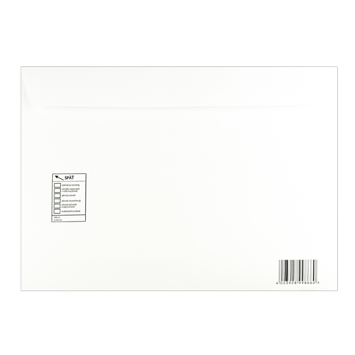 Biele papierové obálky C4 doporučene rozmerov 229 x 324 mm mm, 100 g s odtrhávacou silikónovou páskou.