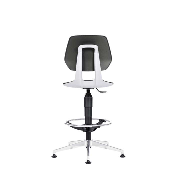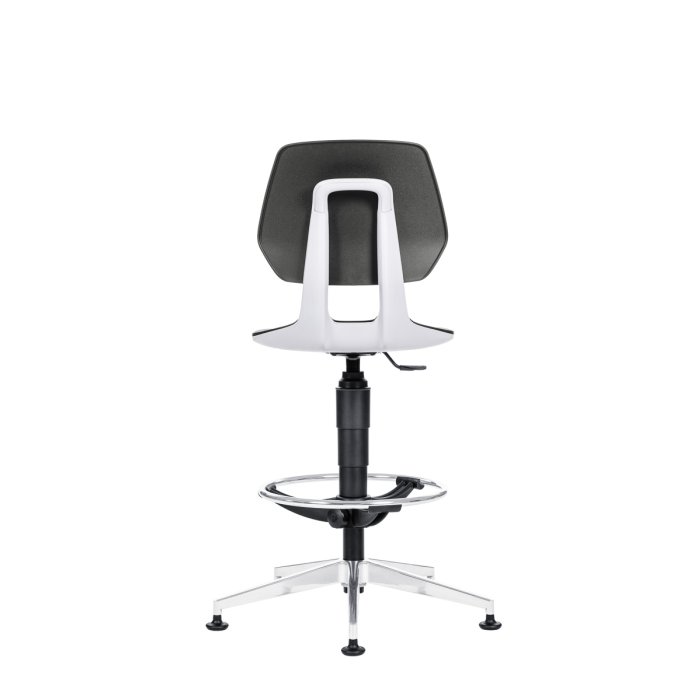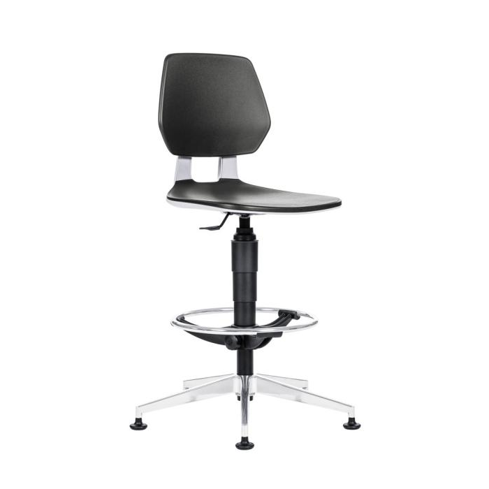Pracovná stolička s čiernym plastovým sedákom a operadlom, sivým madlom, určená pre laboratóriá, projekčné kancelárie a priemyselné prevádzky.