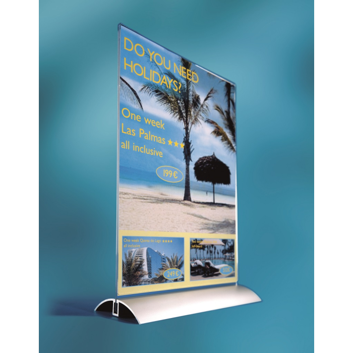 Stojan vhodný na prezentáciu ľubovoľných informácií s dobrou stabilitou. Vrchná časť vyrobená z kvalitného číreho akrylu, elegantný podstavec z hlíníka.