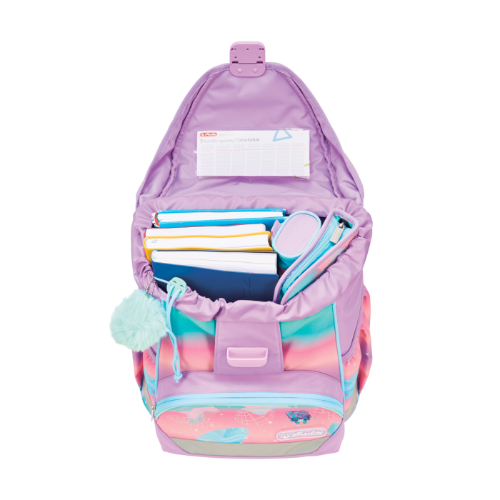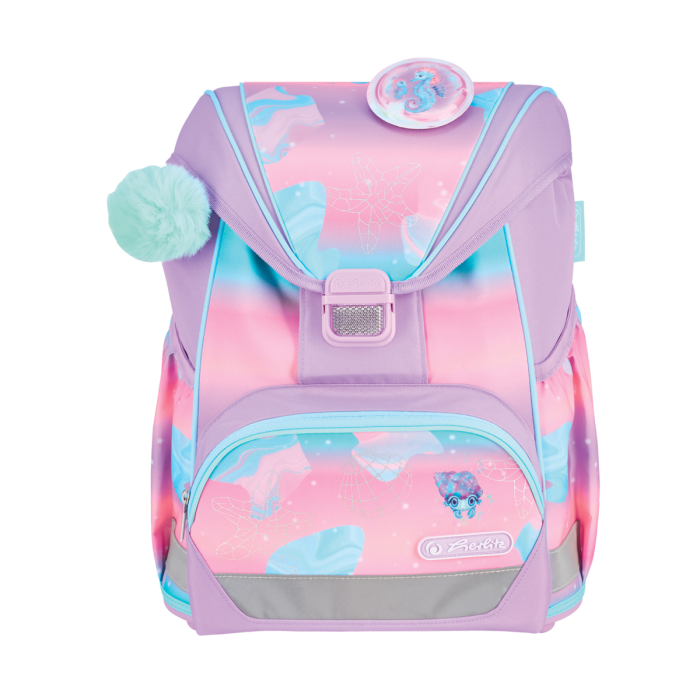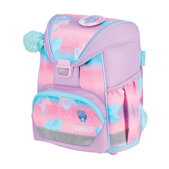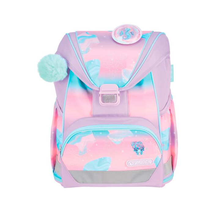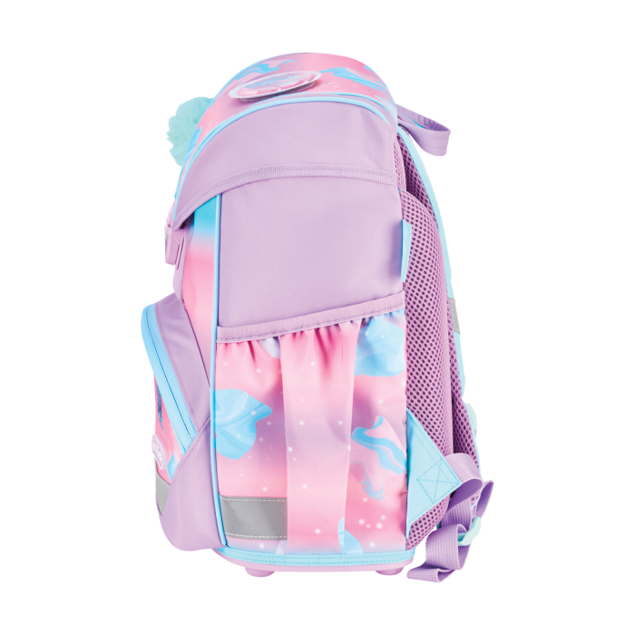Školská taška bez výbavy, s anatomicky tvarovaným polstrovaným chrbtom, širokými nastaviteľnými ramennými popruhmi, hrudným popruhom, predným vreckom, dvomi bočnými vreckami, reflexnými prvkami Oralite, 1x aplikácia na suchý zips, 1 x dekoratívny prvok. Hmotnosť 750 g, objem 15 l, rozmery: 36 x 28 x 21 cm.