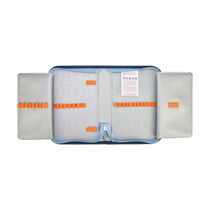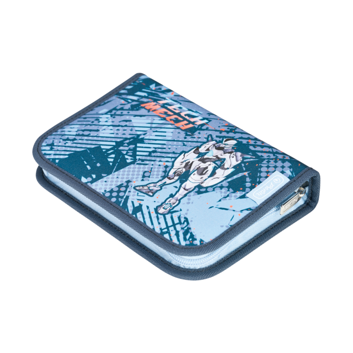 Školská taška s výbavou, s anatomicky tvarovaným polstrovaným a priedušným chrbtom, nastaviteľnými ramennými popruhmi, predným vreckom na zips, dvomi bočnými vreckami s elastickými pásikmi, stabilnou spodná doskou s nožičkami, pohodlnou rukoväťou, reflexnými prvkami Oralite, zatváranie Click lock zips, 1 x odnímateľný odznačik na suchý zips, 1 x dekoratívny prvok. Hmotnosť 800 g, objem 22 l, rozmery: 39 x 32 x 25 cm. Vode-odolná, bez PVC, výbava: peračník prázdny 2 chlopne, vrecko na prezuvky, oválne puzdro.