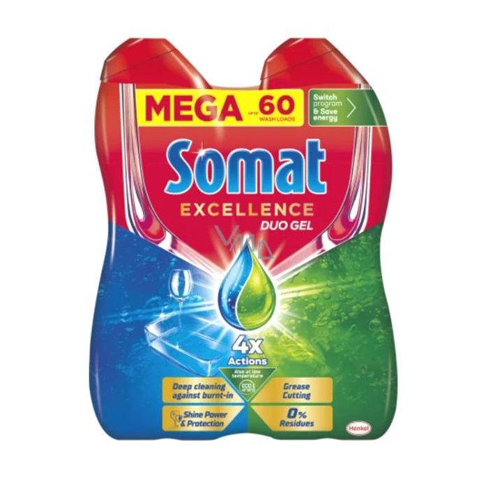 Prostriedok na umývanie riadu Somat Excellence Duo Gel je možné použiť na všetky taniere, poháre, hrnčeky, fľaše, príbory, hrnce a panvice vhodné do umývačky. Zloženie dvoch vzájomne sa dopĺňajúcich umývacích prostriedkov na riad kombinuje silné odmasťovacie a hĺbkovo čistiace receptúry v jednom géli, ktorý rozpúšťa aj tie najodolnejšie pripálené škvrny a usadenú mastnotu. Tekutý umývací prostriedok do umývačky Somat Excellence Duo Gel kombinuje 4 účinky v jednom géli, ktorý odstraňuje pripálené zvyšky jedla, poradí si s mastnotou, nezanecháva žiadne zvyšky a dodáva žiarivý lesk pri každom cykle umývania riadu!