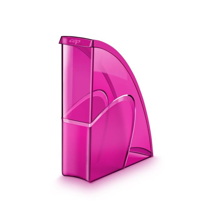 Stojan na časopisy s možnosťou vertikálneho alebo horizontálneho postavenia má elegantné línie, zvýraznené materiálom s kontrastným matným povrchom na hladkom pozadí. Vhodný na dokumenty do veľkosti 24 × 32 cm. Kapacita 700 listov (80 g / m²), rozmery 270 × 85 × 310 mm. Materiál 100% recyklovateľný vysokokvalitný plast. Väčšie balenie 10 ks. Farba transparentná ružová.