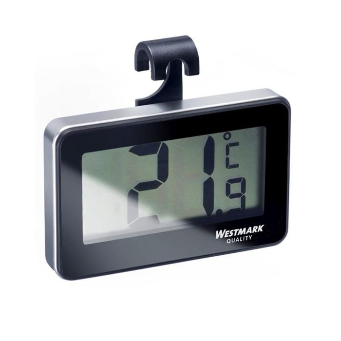 Digitálny teplomer do chladničky od spoločnosti Westmark. Na meranie izbovej teploty aj teploty v chladničke. Klip na zavesenie alebo postavenie. Prídavný magnet. Celkový rozsah teploty: -20 °C až +50 °C. WEEE Reg.č.: DE 813 850 81