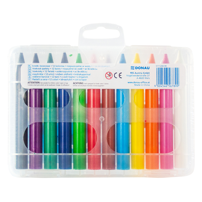 12 vodeodolných farebných voskových pasteliek, ktoré sú ideálne na kreatívne tvorenie. Pastelky sa dodávajú v praktickom posuvnom tubuse pre jednoduché skladovanie a vyberanie. Súčasťou balenia je aj škrabka na pastelky pre ešte viac kreatívnych možností.