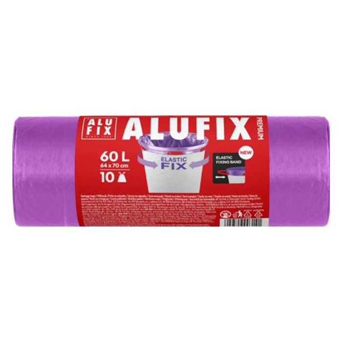 Vrecia na odpad Elastic Fix zaťahovacie s pružnou zaťahovacou páskou, ktorá vrece pevne udrží na odpakovom koši, 60l 10ks na rolke, rozmer 64x70cm hrúbka 22my. fialové, LDPE