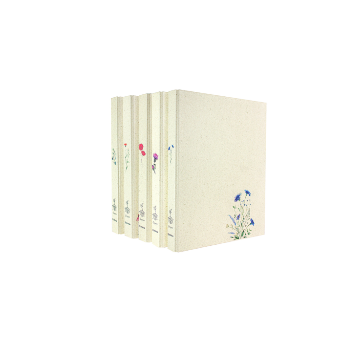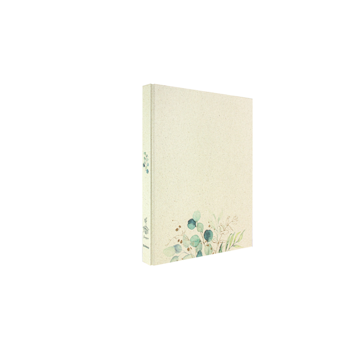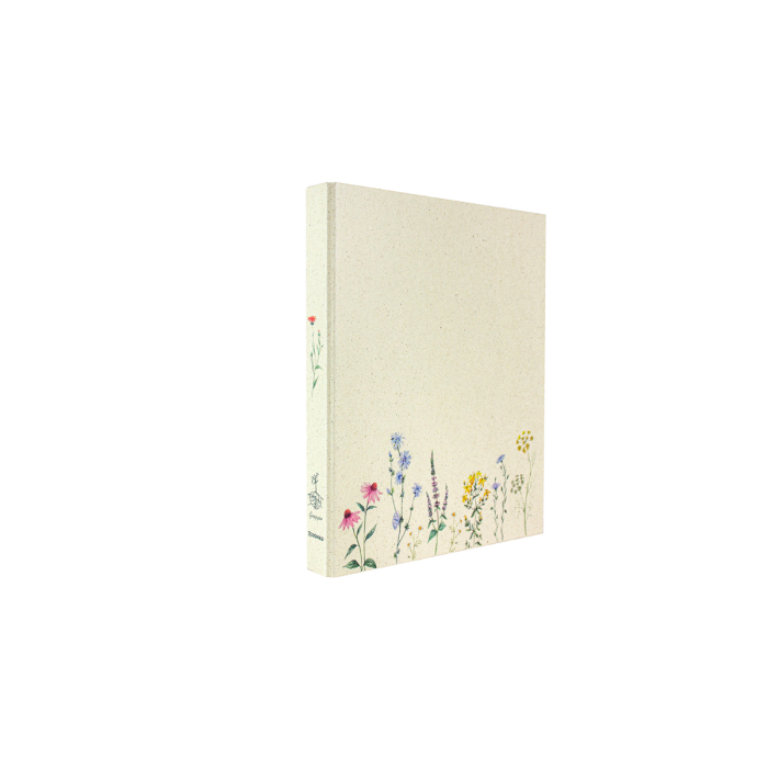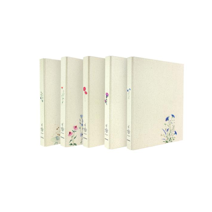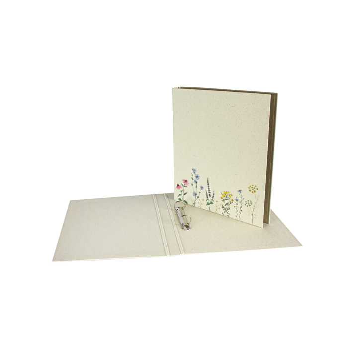 Zakladač krúžkový, 5 rôznych vzorov (2 z každého), vonkajší materiál: trávový papier, farebne potlačený, vnútorný materiál: sivý kartón, vnútorná podšívka: prírodný trávový papier, pre formát DIN A4, 2 krúžky, priemer krúžku 25 mm