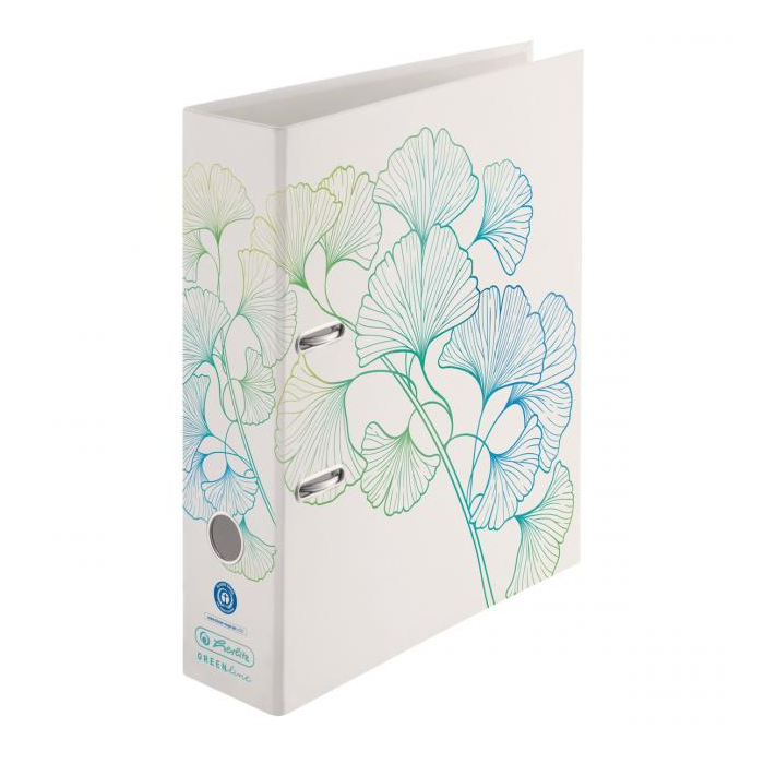 Zakladač maX.file A4/8cm v dizajne GREENline bez štítku. Páková mechanika, radokrúžok, v krémovej farbe s vnútornou stranou z recyklovanej sivej, motív Ginkgo. Certifikát FCS a Blue Angel.